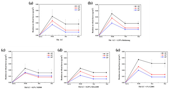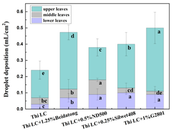 Figure 8 shows the deposition amount of Thi · LC with four adjuvants on wheat’s upper, middle, and lower leaves. Compared with Thi · LC without adjuvants, the addition of adjuvants increased the deposition and distribution of pesticide solution on wheat plants, among which G2801 and Beidatong had a pronounced effect, followed by ND500 and Silwet408. Four adjuvants could significantly increase the deposition of pesticides in different parts of wheat compared with Thi · LC. Figure 7 shows that the point of run-off and maximum retention of Thi · LC added with ND500 and Silwet408 adjuvants on wheat leaves are rarely reduced. Corresponding to the results of this part of the experiment, it is further proved that the selection of different types of adjuvants and the added concentration are essential to the efficacy. The correct use of adjuvants can prevent the loss of pesticide solution and increase efficiency. Besides, under the influence of the plant canopy, the deposition of pesticides in the upper leaves of the wheat plant was the largest. In Figure 8, the deposition of pesticide solution with adjuvants in the lower part of the wheat plant increased slightly compared with pesticide without adjuvants, which also showed that adding adjuvants might increase the penetration ability of pesticide solution in the plant canopy.