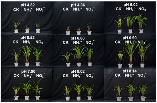 Maize seedlings after 30 days of growth with non-N (CK), NH4+, or NO3− at different soil pHs.