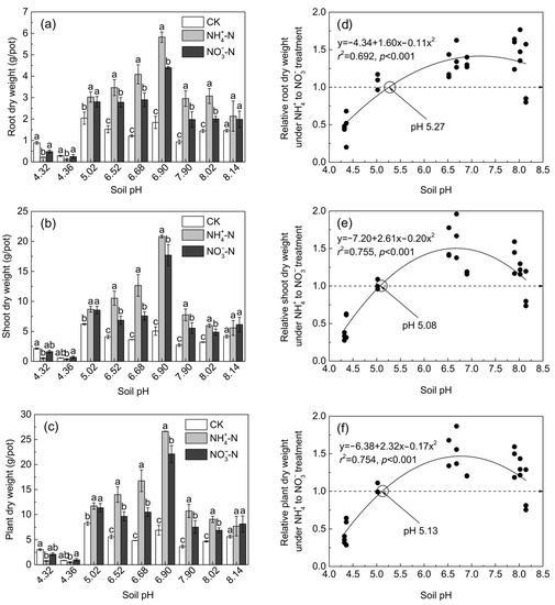 Root, shoot, and plant dry weights under NH4+ supplementation relative to these parameters under NO3− treatment were further used to compare the growth preference of maize for NH4+ vs. NO3−. We conducted a nonlinear regression analysis of soil pH and relative root, shoot, and plant dry weights of maize (Figure 2d–f). As soil pH increased, relative root, shoot, and plant dry weights increased and reached a plateau before eventually decreasing. When the value of relative root, shoot, or plant dry weight was 1.0 in the regression equation, the corresponding soil pH was 5.27, 5.08, or 5.13, which indicates that the growth of maize under NH4+ treatment was equivalent to that under NO3− treatment in soils with a pH of 5.08–5.27. This equation also predicted that maize plants would show a growth preference for NO3− when grown in soils at a pH below 5.08–5.27, with a growth preference for NH4+ indicated in soils with a pH above this range.