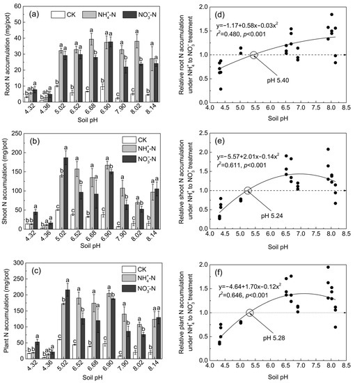 Effect of soil pH on the nitrogen (N) accumulation response of maize to ammonium (NH4+) and nitrate (NO3−) fertilizers. N accumulations in the root (a), shoot (b), and total plant (c). (d–f) Relative N accumulations in the root (d), shoot (e), and total plant (f). Maize seedlings were harvested after 30 days of growth. Relative N accumulation in maize was calculated as the ratio of N accumulation under NH4+ treatment to that under NO3− treatment. Different letters above bars indicate significant differences among NH4+, NO3−, and control (CK) treatments in the same soil.