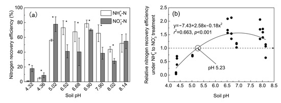 Effects of soil pH on the nitrogen recovery efficiency (NRE) response of maize to ammonium (NH4+) and nitrate (NO3−) fertilizers. NRE (a) and relative NRE (b). Maize seedlings were harvested after 30 days of growth. Relative NRE of maize was calculated as the ratio of NRE under NH4+ treatment to that under NO3− treatment. Asterisks indicate significant differences between NH4+ and NO3− treatments in the same soil.