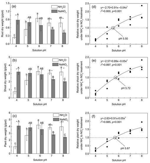 Effect of solution pH on the growth response of maize to ammonium (NH4+) and nitrate (NO3−) fertilizers under hydroponic conditions. (a–c) Dry weights of the root (a), shoot (b), and total plant (c). (d–f) Relative dry weights of the root (d), shoot (e), and total plant (f). Maize seedlings were harvested after 15 days of growth. Relative root, shoot, and plant dry weights of maize were calculated as the ratio of dry weight under NH4+ treatment to that under NO3− treatment. Different lowercase and capital letters above bars indicate significant differences among different solution pHs under NH4+ and NO3− treatments, respectively. Asterisks indicate significant differences between NH4+ and NO3− treatments at the same solution pH.