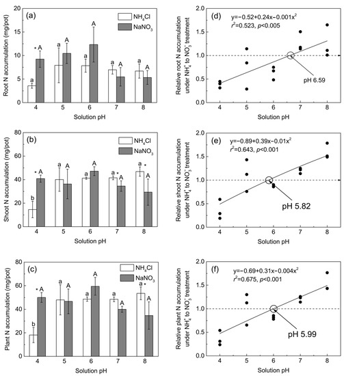 Effect of solution pH on the nitrogen (N) accumulation response of maize to ammonium (NH4+) and nitrate (NO3−) fertilizers under hydroponic conditions. (a–c) N accumulations in the root (a), shoot (b), and total plant (c). (d–f) Relative N accumulations in the root (d), shoot (e), and total plant (f). Maize seedlings were harvested after 15 days of growth. Relative N accumulations in roots, shoots, and whole plants were calculated as the ratio of N accumulation under NH4+ treatment to that under NO3− treatment. Different lowercase and capital letters above bars indicate significant differences among different solution pHs under NH4+ and NO3− treatments, respectively. Asterisks indicate significant differences between NH4+ and NO3− treatments at the same solution pH.