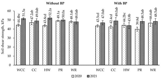 Soil shear strength. Note. BP—biopesticides (Factor A). Undersown cover crops (Factor B): WCC—without cover crop, CC—crimson (incarnate) clover, HV—hairy (winter) vetch, PR—perennial ryegrass, WR—winter rye. Differences between the averages of treatments marked with different letters (a, b, c, d) are significant (p < 0.05); error bars indicate the standard error.