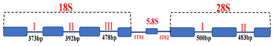 Sizes and distribution of the introns in the ribosomal DNA of P. brassicae. Shaded boxes represent the exonic parts, the exonic parts are connected by the lines with Roman numerals (I, II, and III) above that represent the intronic sequences. Small subunit (18S) and large subunit (28S) are separated by the ITS regions and 5.8S. Numbers under the lines indicate the sizes of individual introns in base pair (bp).