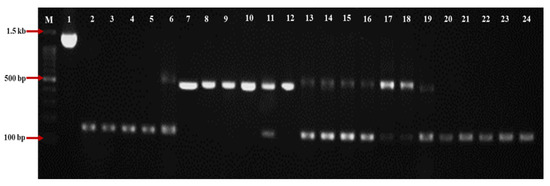 PCR products illustrate the 18S intron I distribution (app. 530 bp, primers listed in Table S1) of two groups, the Cardamine and crop groups. Lane M represents the standard ladder (arrows pointed at 1.5 kb, 500 bp, and 100 bp). Lane 1: Rorippa palustris (906 bp). Lanes 2–7 represent the Cardamine group, including Kumamoto, Yamaguchi, Akiota, Togochi, Nagasaki, and Nara, respectively. Lanes 8–24 represent the crop group, including Fukuoka, Aichi, Itoshima, Hokkaido, Ishikawa, Gunma, Nagasaki, Onga, Ibaraki, Saga, Hagi, Osaka, Fukutsu, Shimane, Kurume, Wakamatsu, and Karatsu, respectively. Populations distinguished by genotypes such as homozygous either missing the introns displaying the 102 bp of the exonic parts (2–5, 20–24) or retaining one band of the introns (7–10, 12), and heterozygous by having both bands (11, 13–19). Faint bands observed in several lanes, other than the distinct and sharp main products due to the purity of DNA.