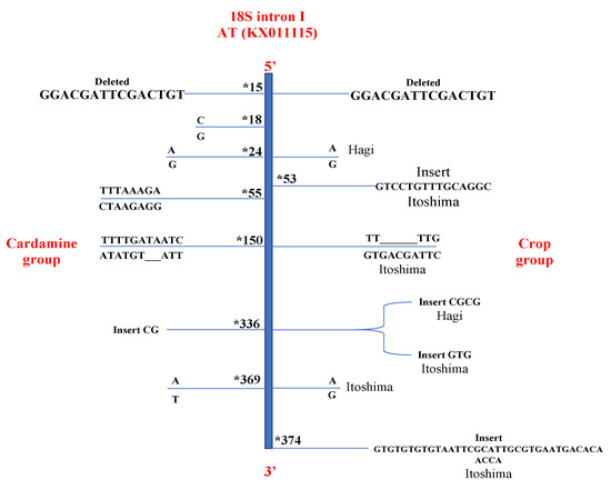 The scheme of intraspecific variability acquired in the 18S intron I from the examined populations of two groups, the Cardamine and the crop groups, designated based on the 18S intron I of the AT isolate (KX011115). Numbers with * describe the positions’ nucleotides originating in KX011115. Some mutated clusters of nucleotides and single point mutations are demonstrated beneath the lines (where above the lines is the original sequence of KX011115), and an underline among the clusters denotes the deleterious nucleotides.