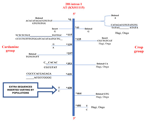 The scheme of intraspecific variability acquired in the 28S intron I from the examined populations of the two groups, the Cardamine and the crop groups, designated as the standard of the 28S intron I of the AT isolate (KX011115). Numbers with * describe the positions’ nucleotides originating in KX011115. Some mutated clusters of nucleotides and single point mutations are demonstrated beneath the lines (where above the lines are the original sequences of KX011115), and an underline among the clusters denotes the deleterious nucleotides.