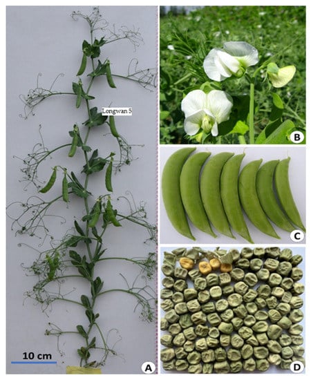 - Yang, X.; Gou, Z.; Zhu, Z.; Wang, C.; Zhang, L.; Min, G. Breeding and Evaluation of a New-Bred Semi-Leafless Pea (Pisum sativum L.) Cultivar Longwan No. 6. Agronomy 2022, 12, 850. [Google Scholar] [CrossRef]