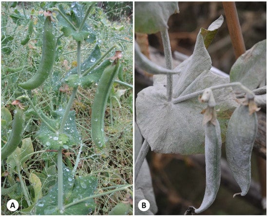 - Ondřej, M.; Dostálová, R.; Hýbl, M.; Odstrčilová, L.; Tyller, R.; Trojan, R. Utilization of afila types of pea (Pisum sativum L.) resistant to powdery mildew (Erysiphe pisi DC.) in the breeding programs. Plant Soil Environ. 2003, 49, 481–485. [Google Scholar] [CrossRef]