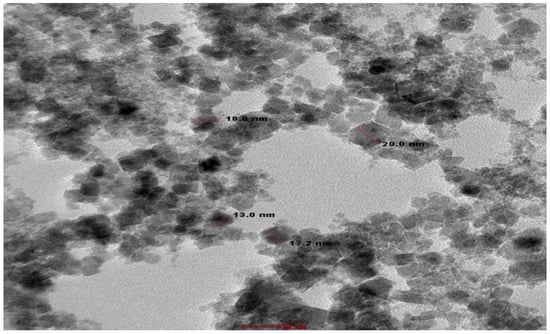 By using TEM imaging, the physicochemical properties of Fe-NPs were considered (Figure 1). The images of synthesized magnetite nanoparticles with an average particle size of 9–14 nm and a large number of diffraction rings characteristic of crystalline spherical Fe-NPs. The nanoparticles used in this study have a mean diameter of 12.6 nm, suggesting that the particles can cross bio-membranes.