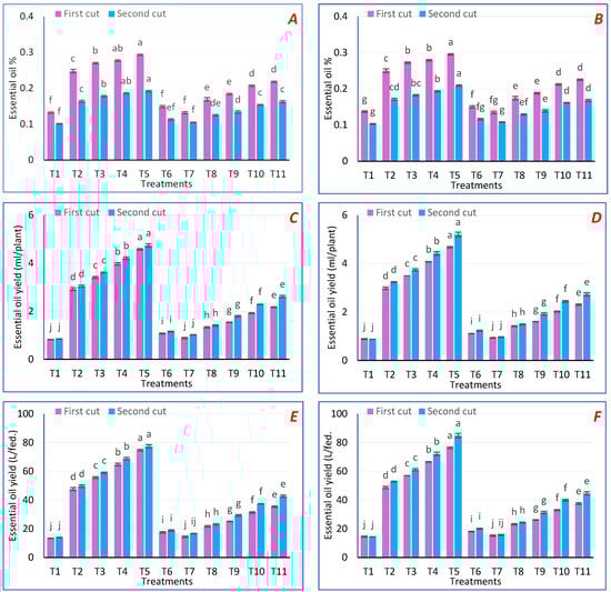 Effect of iron (nano, sulfate, and chelated) foliar spray on EO oil yield of Sweet Scented geranium during experimental seasons. (A) EO % in two cuts of the 1st season, (B) EO % in two cuts of the 2nd season, (C) EO yield (mL/plant) in two cuts of the 1st season, (D) EO yield (mL/plant) in two cuts of the 2nd season, (E) EO yield (L/fed.) in two cuts of the 1st season, (F) EO yield (L/fed.) in two cuts of the 2nd season. Means of three replicates are presented with ± SE. For each parameter in the year, different letters within the column show significant differences between the treatments and control according to Tukey’s HSD test at p ˂ 0.05. T1, T2, T3, T4, T5, T6, T7, T8, T9, T10, and T11 are control, 5 mg L−1 Fe-NPs, 10 mg L−1 Fe-NPs, 5 mg L−1 Fe-NPs HA, 10 mg L−1 Fe-NPs HA, 100 mg L−1 FeSO4, 200 mg L−1 FeSO4, 100 mg L−1 EDDHA, 200 mg L−1 EDDHA, 100 mg L−1 EDTA, and 200 mg L−1 EDTA, respectively.