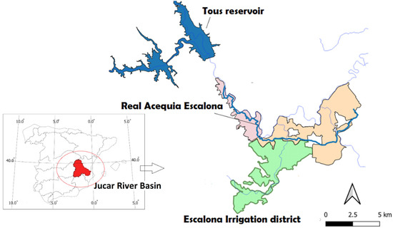 The Real Acequia de Escalona (RAE), an irrigation canal of 23 km located in the lower Jucar river basin Figure 2, brings water from a dam located downstream of the Tous reservoir and ends in the municipality of Villanueva de Castellón (Source: https://sequiaescalona.org/quienes-somos) (accessed on 15 September 2021). Four irrigation districts (Comunidad de Regantes, CR), about 2700 ha in total, benefit from the water provided by the RAE: CR Real Acequia de Escalona (66.07%), CR Sumacárcer (12.69%), CR del Valle de Cárcer y Sellent (12.58%) and CR La Defensa de los Derechos de Riego de las Tierras del Valle de Cárcer (8.66%). We chose two citrus crops (orange and tangerine) to analyze in this study since they are the most representative in the area (approximately 90% of the total crops). The irrigation districts in the RAE have particular qualities whose analysis may be very useful for insurance design. For instance, these communities have the right to administer and distribute the water allocated to them, as well as a legal status that grants them the economic management of the water in that area.