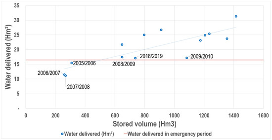 Given the above, to identify actual periods of water scarcity, we determined the storage in the three main reservoirs that regulate the water supply in the Jucar river basin on 1 April and compared it to the actual volume of water delivered to the RAE (Figure 4). The drawn red line represents the minimum amount of water that ought to be delivered during a drought period (16.5 Hm3). There is a direct relationship between the amount of water stored and the amount of water that was delivered for irrigation. According to this analysis, between 2005 and 2019, there were three years in which less water than the minimum volume was delivered, which means that a hydrological drought took place during those years (2005–2008). Moreover, even though there was a relatively high initial storage in the reservoirs during 2008/2009, 2009/2010, and 2018/2019, the actual amount of water delivered during those years was very close to the minimum, which generated economic impacts in the irrigation districts.
