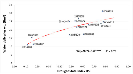 The model used to estimate the irrigation water deliveries in comparison with the DSI measured on 1 April, i.e., before the irrigation season, in the RAE (Equation (12)) is obtained by considering the historical water deliveries to the irrigation districts (). Figure 5 shows the high correlation between these variables obtained in the model.