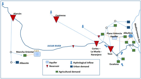 Simplified schematic of the Júcar river system. Source: [56,61].