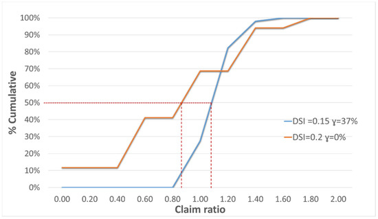 When the simulation was run with a DSI trigger of 0.2, the average value of the claim ratio was 0.74 and the claim rate ranged between 0.6 and 1.4 in 82% of the cases (Figure 7). On the other hand, when the simulation was run with a SI of 0.15 and a γ = 37%, the average value of the claim ratio was 1.1. The claim rate peaked at 1.6 under these conditions, and no claims were made in 52% of the cases.