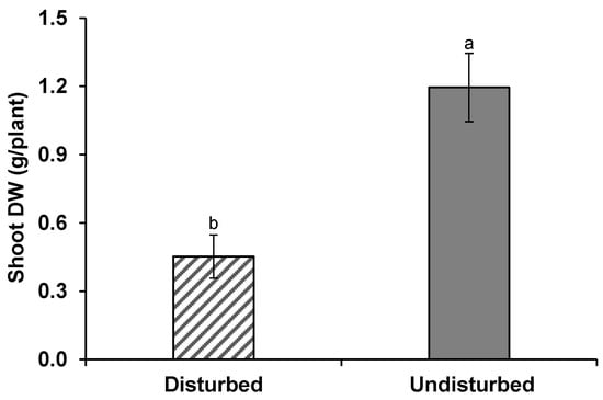 Dry weight (DW) of the shoots of wheat plants grown in disturbed (striped columns) or undisturbed (grey columns) acidic soil, after the growth of Ornithopus compressus. Data are presented as means ± standard error of four independent biological replicates. Different letters indicate statistically significant differences (p < 0.05).
