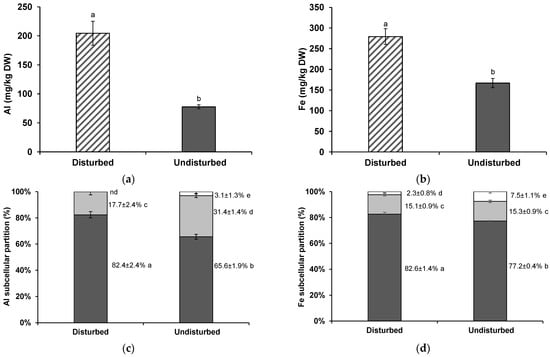 Concentration (average and standard error) of Al (a) and Fe (b) in the shoots of wheat plants grown in disturbed (striped columns) or undisturbed (grey columns) acidic soil, after Ornithopus compressus growth. The proportions (average and standard error) in the cell wall fraction (dark grey columns), organelle fraction (light grey columns), and vacuole contents fraction (white columns) were also determined for Al (c) and Fe (d). Values next to bars are the element percentages for each fraction. nd = Below detection limits. Different letters indicate statistically significant differences (p < 0.05).