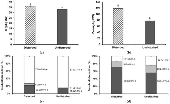 Concentration (average and standard error) of K (a) and Zn (b) in the shoots of wheat plants grown in disturbed (striped columns) or undisturbed (grey columns) acidic soil, after Ornithopus compressus growth. The proportions (average and standard error) in the cell wall fraction (dark grey columns), organelle fraction (light grey columns), and vacuole contents fraction (white columns) were also determined for K (c) and Zn (d). Values next to bars are the element percentages for each fraction. Different letters indicate statistically significant differences (p < 0.05).
