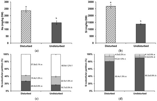 Concentration (average and standard error) of Na (a) and Si (b) in the shoots of wheat plants grown in disturbed (striped columns) or undisturbed (grey columns) acidic soil, after Ornithopus compressus growth. The proportions (average and standard error) in the cell wall fraction (dark grey columns), organelle fraction (light grey columns), and vacuole contents fraction (white columns) were also determined for Na (c) and Si (d). Values next to bars are the element percentages for each fraction. Different letters indicate statistically significant differences (p < 0.05).