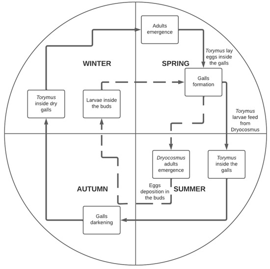 The life cycle of D. kuriphilus starts in early summer (June–July) with the emergence of adults, which lay eggs exclusively into the chestnut tree buds during the summer and their larvae overwinter inside the buds [20]. Adult longevity is less than 10 days, during which they can lay more than 100 eggs in groups of three to five per bud [20]. At the begging of the spring, when the chestnut tree begins its vegetative activity, the D. kuriphilus larvae induce the formation of insect galls and feed for approximately 30 days until they achieve pupation, which will last until the beginning of summer, when the adult insect emerges. Thus, the occurrence of D. kuriphilus and their galls is shaped by the distribution of their host plant, their ecological interactions include oviposition, gall formation, parasitism and feeding. Parasitoid T. sinensis is an univoltine species, with one generation per year, and haplodiploid, giving birth to haploid males from unfertilized eggs and diploid females from fertilized ones [24]. Females of T. sinensis lay their eggs in early spring (March–April) inside the newly formed galls (in the body of the host D. kuriphilus, or in the wall of the larval chamber). Usually, one egg is placed per host larvae, but under natural conditions, several eggs per larva have been observed in a single chamber. However, only one parasitoid larva completes its development due to cannibalism among the larvae of T. sinensis. After emerging, the larva feeds from their host larva at the end of spring and enter into a dormant state until late winter, when pupation starts. Synchronous with the developing of chestnut trees and the formation of galls caused by D. kuriphilus, adults of T. sinensis emerge in early spring. The life duration of T. sinensis depends mainly on the ambient temperature and the type and quantity of food available, and adults can reach 40 or more days [25]. The length of the egg deposition season for T. sinensis is normally set according to its lifespan [26]. Figure 1 shows the schematic life cycle of D. kuriphilus and T. sinensis.