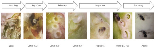 The observations of the chestnut buds and galls and the monitoring of the emergence of adults of D. kuriphilus allowed us to determine the evolution of the different stages of development (Figure 3).