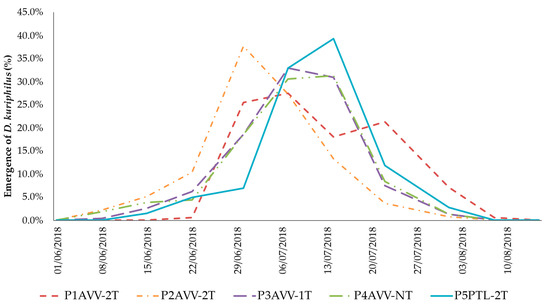 Weekly evolution of D. kuriphilus emergence in five chestnut orchards in Minho (P1–P5) located in Arcos de Valdevez (AVV) and Ponte de Lima (PTL), with one (1T), two (2T) or no treatment (NT) of T. sinensis in 2018.