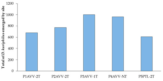 The parasitism rate (Table 5) varied between 6.7% (P3AVV1T) and 9.7% (P2AVV27), considering the ratio between the number of chambers with the presence of parasitoids and the total number of chambers.