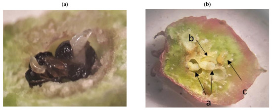 (a) Confirmation of the presence of parasitoids with a spring gall showing D. kuriphilus pupa parasitized by two parasitoid larvae; and (b) the natural parasitism of D. kuriphilus with a dissected spring gall where (a) two parasitized D. kuriphilus larvae; (b) parasitoid larvae; (c) parasitoid pupa.