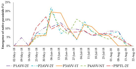 Weekly evolution of the emergence of native D. kuriphilus parasitoids in five chestnut orchards (P1 to P5) located in Arcos de Valdevez (AVV) and Ponte de Lima (PTL), with one (1T), two (2T) or no treatment (NT) from T. sinensis in 2018.