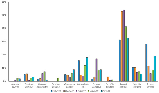 Relative abundance of parasitoids identified in 2018 in chestnut orchards located in Arcos de Valdevez (AVV) and Ponte de Lima (PTL), with one (1T), two (2T) or no treatment (NT) of T. sinensis.