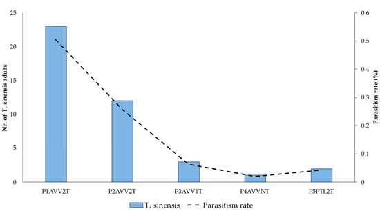 T. sinensis parasitism rate and the number of adults emerged between February and March 2019 in the five chestnut orchards of Minho (P1 to P5), located in Arcos de Valdevez (AVV) and Ponte de Lima (PTL), with one (1T), two (2T) or no treatment (NT) of T. sinensis.