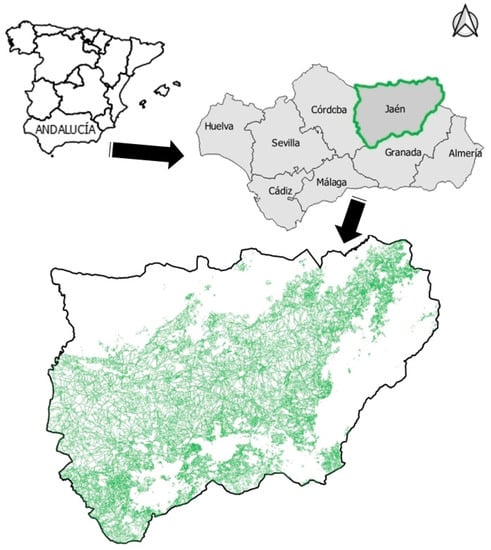 Worldwide, one of the most characteristic regions of olive monoculture is the province of Jaen, in southern Spain. It is the world’s largest producer of olive oil, so a large part of Jaen’s economy is based on olive monoculture (in fact, the olive grove plantations occupy the majority of the territory) []. It represents more than 25% of the total olive grove area in Spain and 42% of Andalusia’s total cultivated land. Its production on average is approximately 50% of the Spanish total of olive oils and more than 20% of the world’s total []. This territory has an area of approximately 13,489 km2, so due to both its size and biodiversity, it presents different agronomic conditions. The olive plantation surface in this location is around 5.93 × 105 hectares, of which 2.88 × 105 are rainfed and 3.04 × 105 are irrigated []. Most of the irrigated area is arranged in broad frames of traditional cultivation (88% of the irrigated olive grove area versus 12% of intensive olive groves) [].