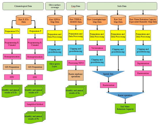 Detailed flow diagram of the methodology, (GIS is geographic information systems; IDW is inverse distance interpolation; SIPNA and TERRA-MODIS are described in Section 2.2; climatological data P and ETo are described in Section 2.3; NDVI and Kc are described in Section 2.4; soil data are described in Section 2.5).