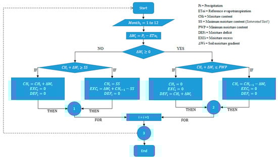 To obtain the water balance, the procedure described in Figure 3 was followed []. With this balance, we can quantify, for each period of time analyzed (in this case, each month), the behavior of soil moisture and determine both the excesses (those values that exceed soil saturation, and which give rise to runoff), and the moisture deficits (at levels close to the permanent wilting point).