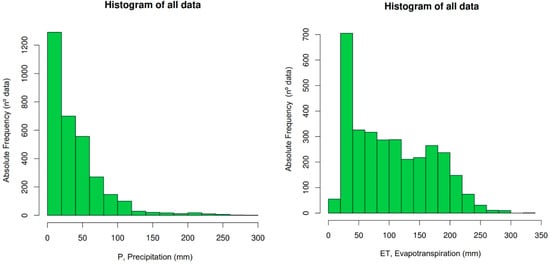 The climatic variables analyzed were the data corresponding to the monthly averages of evapotranspiration and precipitation during the period 2006–2020 obtained from the agroclimatic stations of the study area, (Supplementary Material S1). Figure 4 shows the frequency distributions of the data obtained for precipitation (P) and reference evapotranspiration (ETo) at the agroclimatic stations.
