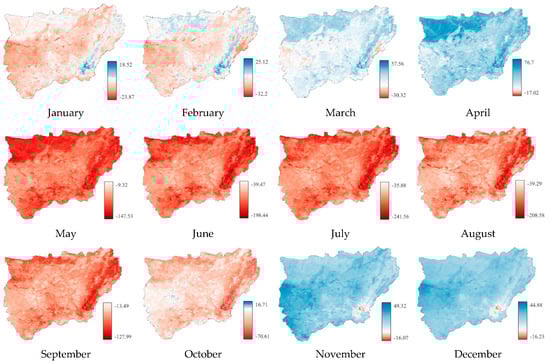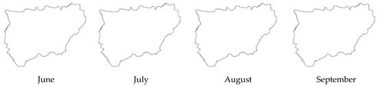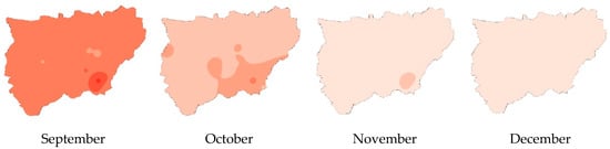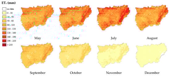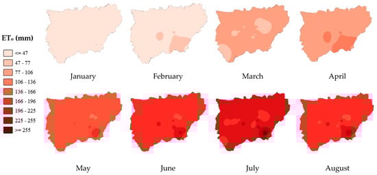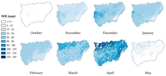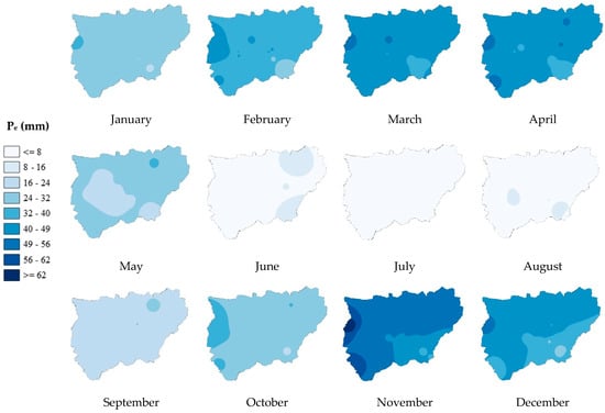 The results obtained were represented in the study area by using GIS techniques with the application of the inverse distance weighted (IDW) interpolation method [,], with a pixel resolution of 5 m. Effective precipitation (Pe) is considered to be 75% of the rainwater [] that manages to infiltrate into the soil without being lost to runoff or deep infiltration [,,,,,,,,,,,,,,,,,,,,,,,,,,,,,,,,,,,,,].