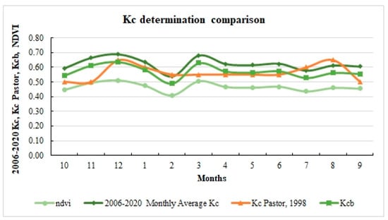 Values of Ks and Ke were estimated using those of the usual drip system and weekly irrigation [], (Ks = 1, Ke = 0.05 was adopted). Calera et al. [] estimated Kcb with the vegetation index NDVI: