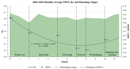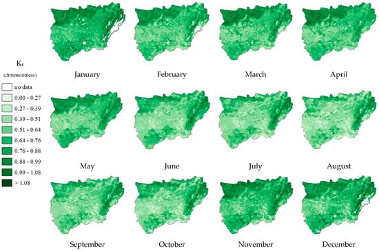 The above equation allows us to obtain Kc values from an image in which NDVI has been previously calculated for each pixel. The sequence of images, in turn, allows us to study the monthly evolution of the canopy, showing both spatial and temporal variability. Therefore, we can obtain