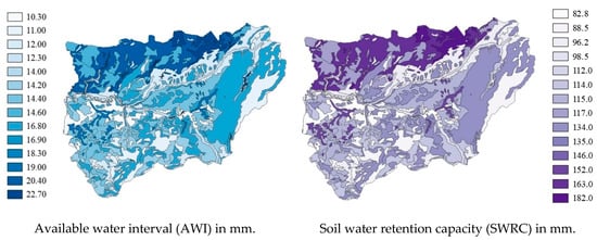 The available moisture interval (AWI) and water retention capacity (SWRC) were determined as a function of soil type in the study area []. AWI refers to the amount of water theoretically available to plants that they can absorb. AWI was calculated as the difference between the values of the field capacity (FC) and permanent wilting point (PWP) levels [,]. On the other hand, soil water retention capacity (SWRC) refers to the AWI in the soil profile up to the depth where the roots are located []. Therefore, we have: