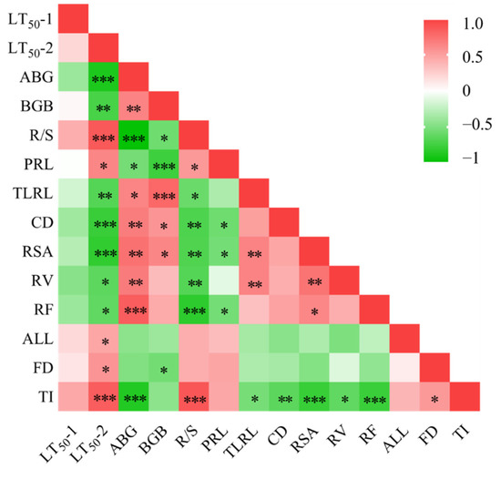 3.5. Correlation Analysis between LT50 and Phenotypic Traits