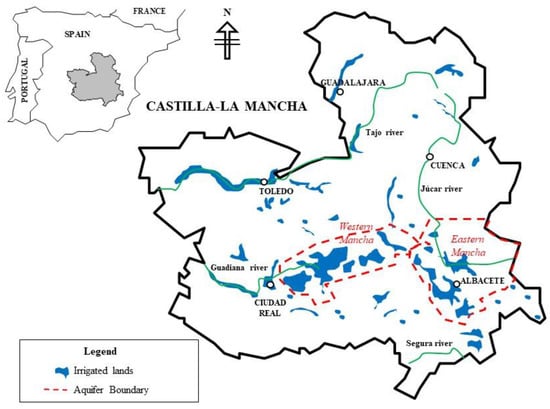 The main irrigable areas in CLM depend on groundwater resources that belong to western and eastern Mancha aquifers (Figure 1). These hydrogeological systems are controlled by the water authorities called the Confederación Hidrográfica del Guadiana (CHG) and Confederación Hidrográfica del Júcar (CHJ) to avoid the overexploitation problems that arose during the transformation from rainfed to irrigated farms more than 40 years ago [,,]. In the case of the irrigation area of the western Mancha aquifer, each year, CHG (www.chguadiana.es) (accessed on 16 February 2022) determines the volume of water that can be extracted and the amount each farm can use. This is regulated by means of meters installed on every farm, which are read by technicians from the Association of Groundwater Users (CUAS, in its Spanish acronym), who transmit the data to the CHG in order to check user compliance. This is an efficient way to control the water extracted from bodies of groundwater and to ensure its sustainability, if combined with monitoring of the piezometric levels of the aquifers, as specified in the hydrologic plan of the basin. In the case of eastern Mancha, the CHJ (www.chj.es) (accessed on 16 February 2022), in conjunction with the Junta Central de Regantes de la Mancha Oriental (irrigation board) (www.jcrmo.org) (accessed on 16 February 2022), is responsible for administering the available water resources. The difference between this area and western Mancha is that, instead of using meters to regulate water use, the farmers are required to present an exploitation plan (crops and area of their farm to be cultivated), where, after determining the mean consumption of irrigation water per crop, the estimated total = Σ (irrigated area per crop x mean irrigation volume applied to each crop) must not exceed the theoretical amount of water allocated to the farm. The advantage of this methodology is that the farmers’ use of water is not limited, which allows them to meet the irrigation requirements of crops when climate conditions are unfavorable. In this case, it is the land to be cropped that is limited. However, if they wish, farmers can install a meter and operate as in western Mancha.