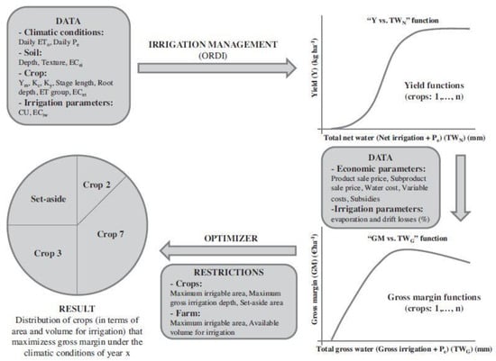 In this sense, the aim of MOPECO is to maximize the economic gross margin (GM) through the efficient use of irrigation water. A set of data (Figure 2) is required for the simulation of the optimal “Yield vs. Total Net Water” (Y vs. TWN), a function for each crop under the climatic conditions of a certain year. In this function, TWN = net irrigation (IN) + effective rainfall (Pe). To obtain Y vs. TWN, the model simulates a range of deficit irrigation schedules using the optimized regulated deficit irrigation (ORDI) methodology [,,,,,,,,], considering the effects of irrigation uniformity [] and electrical conductivity of water [] on yield. The Y vs. TWN function is translated into “Yield vs. Total Gross Water” (Y vs. TWG), where TWG = gross irrigation (IG) + Pe, to include efficiency of applying the irrigation system (in this case “solid set system”). The GM vs. TWG function is then calculated using economic data on the crop. Finally, the model calculates the optimal distribution of crops that meets the restrictions imposed by the user (Figure 2).