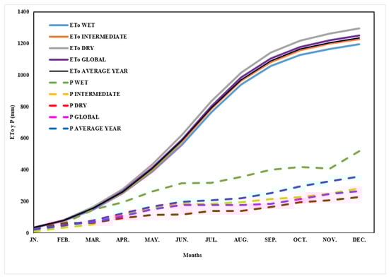 Cumulative daily evolution of reference evapotranspiration (ETo) and precipitation (P) for average year and typical meteorological years (global, dry, intermediate, and wet).