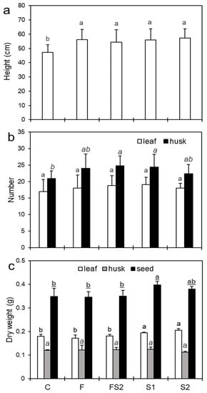 Effect of EAF slag on plant growth. (a) Plant height, (b) number of leaves and husks, and (c) dry weight of leaf, husk and seed in bean plants cultivated in: control soil (C—soil without EAF slag or NPK fertilizer), soil enriched with NPK fertilizer (F), soil enriched with a combination of 2% EAF slag and NPK fertilizer (FS2), and soil enriched with EAF slag (S1—at 1%, S2—at 2% level). Error bars present standard deviations. Different letters indicate significantly different values at p < 0.05.