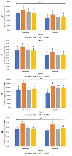 Figure 1. Effect of bacterial inoculation on (A) final percentage germination (%), (B) germination rate index (%), (C) seedling length vigor index, and (D) seedling weight vigor index of the two wheat varieties, Bousselam and Boutaleb. The bar plots represent the mean ± standard error of three different experiments. IBM SPSS Statistics v.24 was used to perform statistical analysis, using a two-way ANOVA and Tukey’s multiple comparison post-test. Significant differences are displayed as: *** p < 0.001. ns: non-significant.