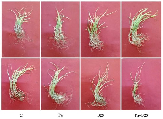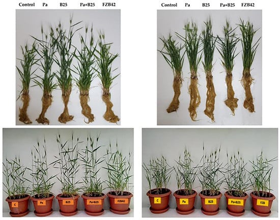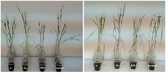 Plastic pots (20 cm in diameter × 18 cm in height), disinfected with a sodium hypochlorite solution, were filled with approximately 4 kg of soil that was previously sieved through a 0.5 cm mesh and air-dried. Wheat seeds were disinfected, germinated, and coated as previously described. Twenty seeds were sown in each pot. The treatments were carried out in five repetitions for each wheat variety, Bousselam and Boutaleb. Five treatments were performed as follows: (1) seeds not inoculated, (2) seeds inoculated with Pa, (3) seeds inoculated with B25, (4) seeds co-inoculated with Pa and B25, and the last treatment, (5) the seeds were inoculated with the bacterium Bacillus velezensis FZB 42 [38] used as a positive control.
