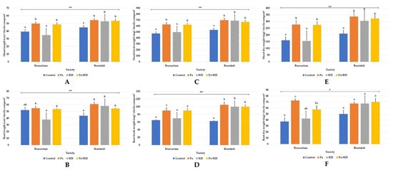 Figure 3. Effect of bacterial inoculation on (A,B) shoot and root length (cm), (C,D) shoot and root fresh weight (g), and (E,F) shoot and root dry weight of wheat plants grown in sterile compost of Bousselam and Boutaleb varieties. The bar plots represent the mean ± standard error of three different experiments. IBM SPSS Statistics v.24 was used to perform statistical analysis, using a two-way ANOVA and Tukey’s multiple comparison post-test. Significant differences are displayed as: * p < 0.05, ** p < 0.01. ns: non-significant.