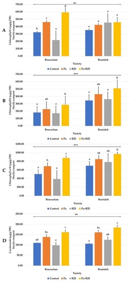 Figure 5. Effect of bacterial inoculation on (A) chlorophyll a (µg/g FW), (B) chlorophyll b (µg/g FW), (C) chlorophyll a + b (µg/g FW), and (D) carotenoid (µg/g FW) contents of wheat plants grown in sterile compost of Bousselam and Boutaleb varieties. The bar plots represent the mean ± standard error of three different experiments. IBM SPSS Statistics v.24 was used to perform statistical analysis, using a two-way ANOVA and Tukey’s multiple comparison post-test. Significant differences are displayed as: *** p < 0.001. ns: non-significant.
